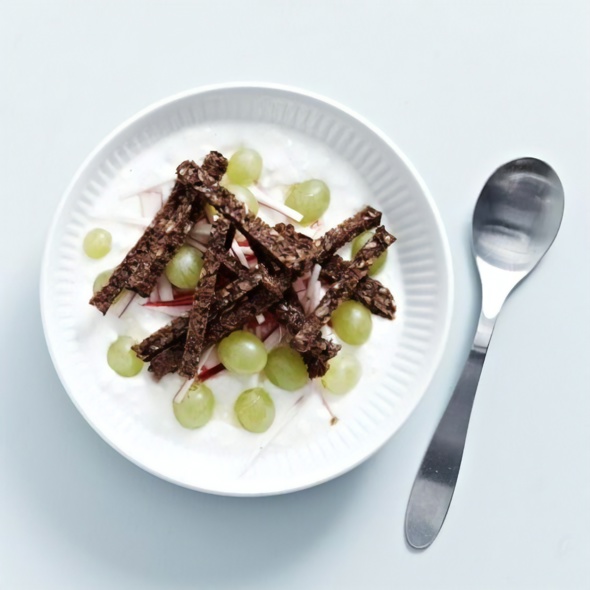 Hytteost og yoghurt med reven rugbrød, rabarber og vindruer