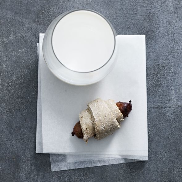 21Server 1 pølsehorn og 1 glas mælk til hver person. Frys resten af pølsehornene ned eller put dem i køleskabet