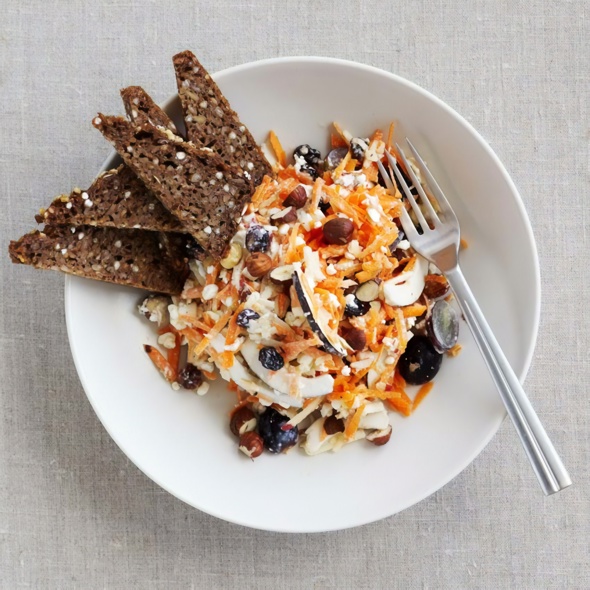 En grov råkostsalat til frokost smager friskt og stiller sulten. Bland hytteost og ristede hasselnødder i salaten, det smager dejligt. Spis lidt rugbrød til salaten.