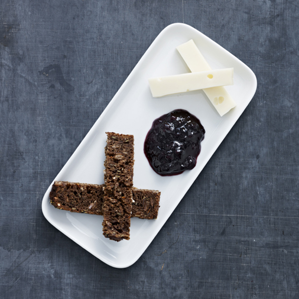 3Spis brød og ost sammen med solbærmarmelade.