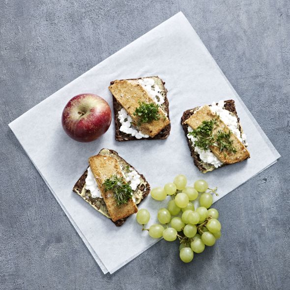9Server 3 stk. rugbrød pr. voksen og 2 stk. pr. barn. Spis et æble og 150 gram vindruer pr. person som dessert