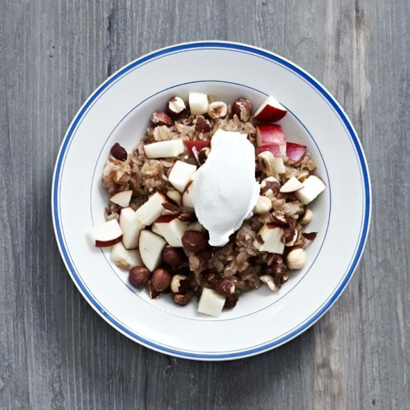 8Kom æble og nødder på grøden og til sidst en klat skyr
