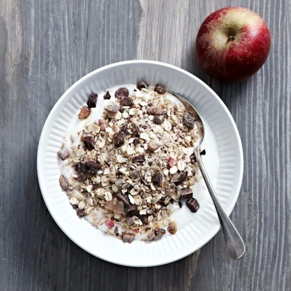 8Bland gryn og kerner med tørret frugt, bær og chokolade
